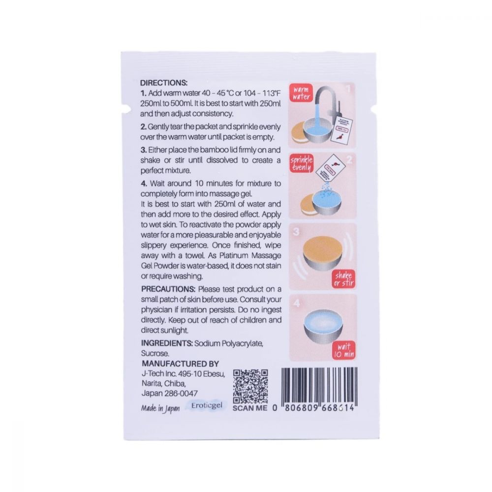 Take the exquisite experience of Japanese Nuru massage with you on the go with our travel pack of authentic Massage Gel Powder. These sachets are crafted in Japan using all-natural ingredients, allowing you to easily up to 500ml of Premium Massage Gel. The water-soluble powder formula is non-greasy and straightforward to clean, delivering a smooth and silky gel that effortlessly glides over your skin, creating a full-body massage or a deeply relaxing therapy session. Our fragrance-free, flavourless, and stain-free formula ensures a purely indulgent experience.